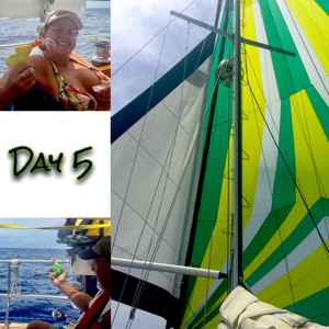 We’ve tried a couple of different sail configurations today but the one that seems to be working best is going wing on wing using the spinnaker off the starboard side with the Jib poled out on the port. We’ve actually been able to get a little over 5 knots this way and that’s pretty nice given the light winds.