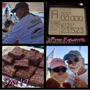 As I come on watch at 0015 local time we are but 39 miles from the equator. It so exciting I feel like a kid on Christmas morning. Grape Ape has been dancing on deck all evening. He’s got his I Love San Diego t-shirt on, has the binoculars out and is searching for that line in the water. Falcor is flying overhead trying to assist Grape Ape in his search and Wilson is on deck helping them to look in the right direction. You, know, with his military background he is a whiz at navigation. Yes, the mood on board is truly electric.