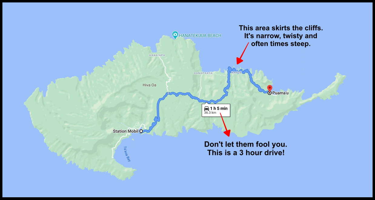 On Sunday morning they delivered the small SUV to us at the dinghy dock. With the rental contract handled the four of us hop into the small SUV and head out for the day. We were given a very, very basic map to lead us to Me’ae Iipona. It lists a handful of stops along the way but like I said, it is VERY basic.