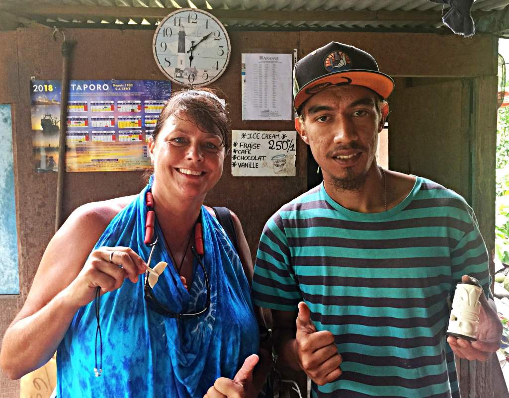 She walks up the road with us asking if we want any fruit and she also lets us know she can make us dinner. Down here it’s common for the locals to make dinner for cruisers, of course they do it for a price. It’s their way of making a little money and sharing some of their local culture. We tell her we will think about it then ask her about finding a tiki carver. We are interested in purchasing some tikis as we’ve heard they have some of the finest carvers in French Polynesia here on the island.