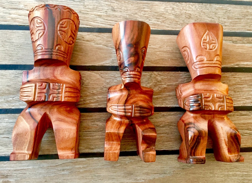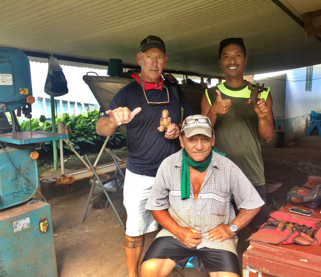 After our long hike we return to the village and stop by Leona’s home. He and his son greet us and show us the completed tiki. Oh my, it’s so lovely. What fine work this man does. In broken English he invites us back into his home and introduces us to his wife, Florida. I’ll always remember her as that’s where I’m from. We walk into an open-air room where they literally have hundreds of tikis all wrapped up. His son explains that they will be sent to Tahiti and other islands to sell. Glad we got ours here at the source. They will be much more expensive in Tahiti. We paid 4000 CFP, which is about $40 USD for all three. In Hiva Oa I saw them and they wanted 4000 CFP for just one and they came from this very village and likely this carver.