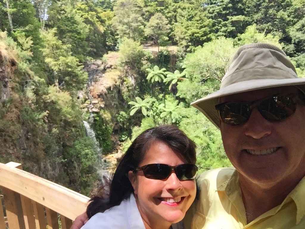 After admiring God’s grand creations we made the loop back to the car park. The entire trip was about an hour. From there we drove to the top level car park. Yes, we could have hiked there but the website says it’s a pretty steep trail and sometimes my asthma just won’t let me hike such difficult trails. That’s okay though. We arrived at the top car park which is the beginning or the end of the McKinnon track. After a short ten minute, easy hike we arrived at a wooden platform that looks out over the Paranui Falls. It was actually quite beautiful. The sun was out and sparkling on the falls and the fern-like Ponga trees were perched to the right of the falls. I just love these trees. Next to the Pohutukawa trees these are my favorite of the New Zealand trees. They are like a forest style palm tree.