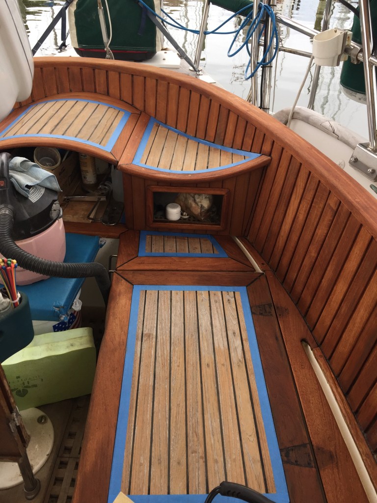 Dan recently spent three weeks varnishing Dazzler’s cockpit. This time he needed to take it back to bare wood which meant it would require eight coats of varnish! Yes, that’s a lot when you consider he has to sand in between each coat. And, like I said, no project is easy. Just after getting started sanding the cockpit he found wood rot in one of the seats. This required him to completely rebuild the seat. He’s never done anything like that before but he didn’t let that stop him and the finished project was perfect!