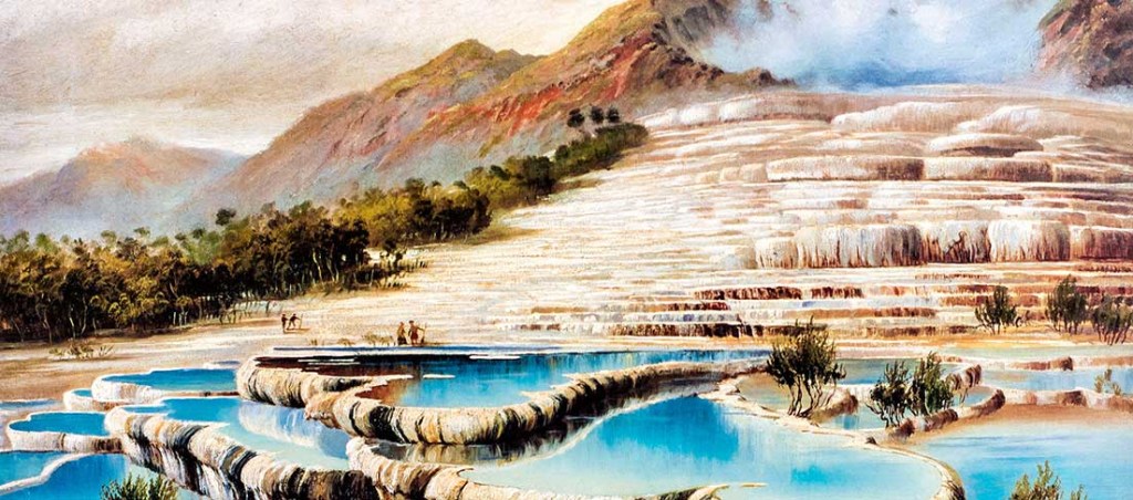 “Before Mt Tarawera erupted in the early hours of June 10th, 1886, the Pink and White Terraces on the shores of Lake Rotomahana were considered to be the eighth wonder of the world, and attracted tourists from far and wide. The terraces had formed over approximately 500 years, as silica rich water flowed down the hillside from boiling geysers. The water cooled and crystallised into the terraces and pools, forming giant staircases or waterfalls.