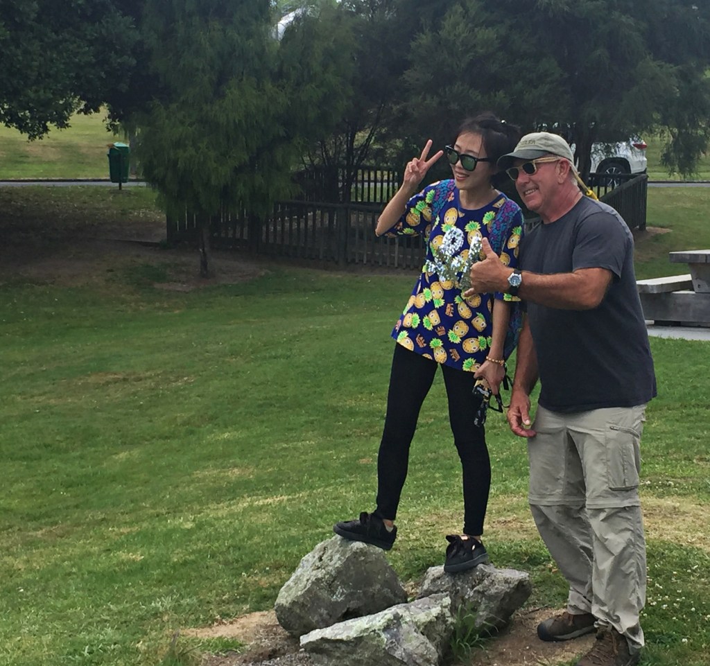The park is rather large and has lots of pathways leading you around ponds, bubbling pools, steam pits and hot mud ponds. These areas are all cordoned off to prevent visitors from getting too close to the super heated pools. Today the park is filled with visitors. Most of them are Asian. With Chinese New Year on the horizon we can only assume they are all on holiday here as there are literally busloads of Asian people all around. The kids are bounding about, laughing and running from pool to pool. Parents are busy taking photographs of their munchkins and Dan and Jack take the opportunity to have some fun getting in their pictures with them.
