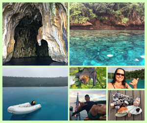 The following morning we awake to an absolutely beautiful day. The sun is out and the water is clear and calm. We decide to head out to the end of Kapa Island to see Swallows Cave. It’s something everyone says you have to see. Last year the weather wasn’t good when we were here so we missed it. We take the dink out to the pointe which is about a mile and a half away. When we arrive there is a dive boat that just arrived so we scoot around them to get to the cave before they are all in the water so we can get some good pics.