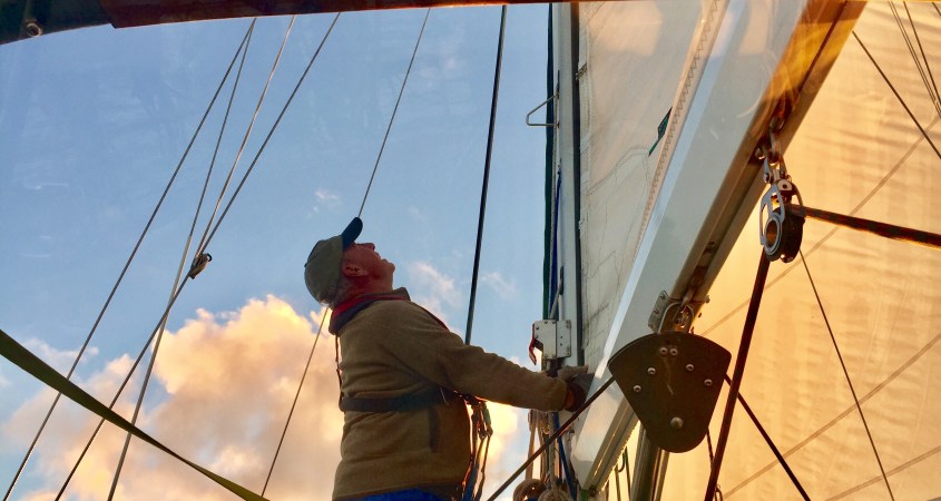 Two hours after I pointed out this issue we get all the tools put away and I’m suggesting that we don’t put up the sail tonight…just motor until morning so we have light when we test it. Dan won’t have it. “I have to have faith in my work” he says as he heads out to hoist the mainsail. More prayers are said on my end. The good news is that was over six hours ago and all is still good. Once again I say….there is NOTHING my man can’t fix!