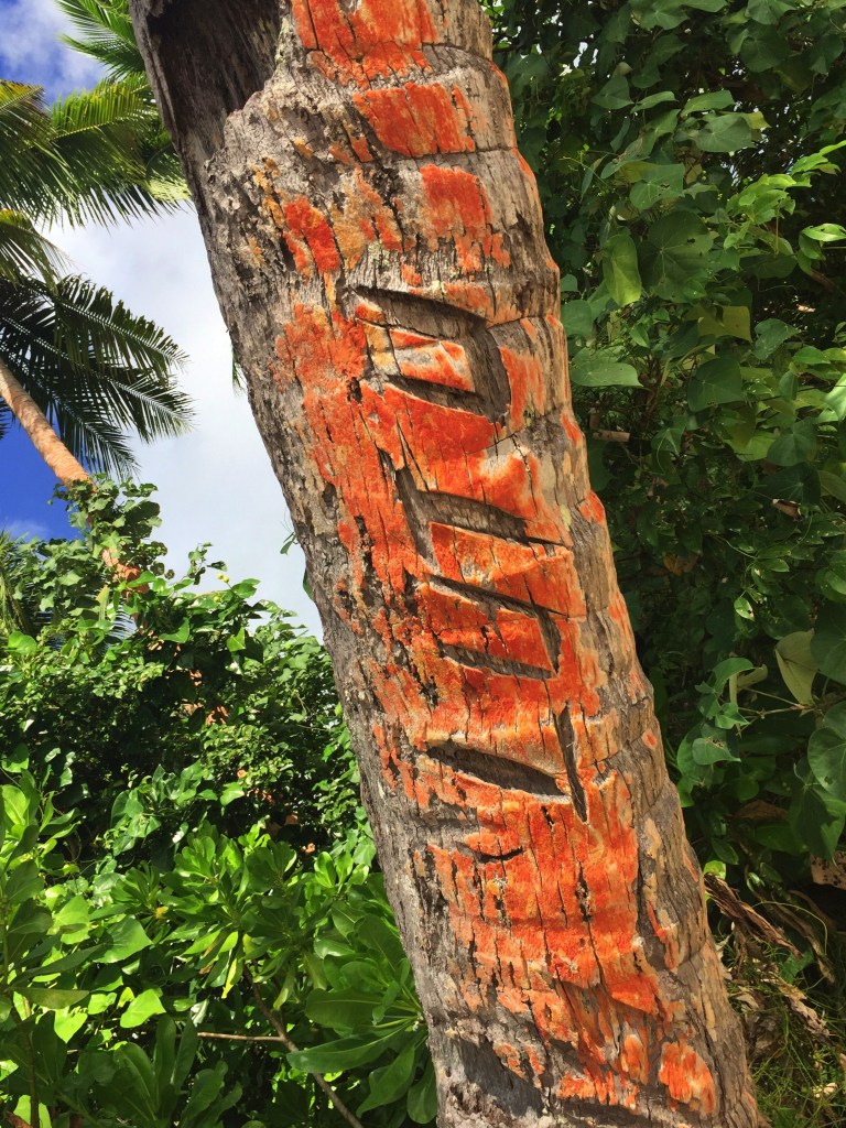 One thing we noticed here is that the coconut palms all have one side that is orange in color. At first glance it appears they are painted but it turns out this is natural. It certainly explains some of the beautiful sunset photos you see of Fiji where the trunks of the trees have that orange glow. Here, the trees near the shore also had carvings on them. They looked as if they had names carved onto the trees. Since no one was around we’ll never know why.