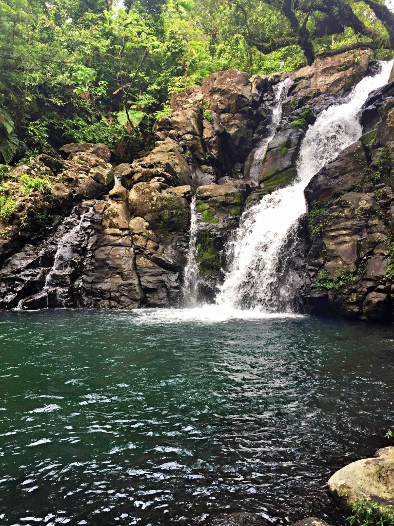 Having paid our fees we are soon on our way. I am pleasantly surprised with the beginning of the hike. It is a wide, grassy path through a beautiful green valley filled with tropical plants and flowers. Along the right side is a fresh water river that is fed by the three waterfalls we are headed to see. There is even a narrow concrete sidewalk for part of the way. Yes, this is my kind of hiking! No problem here….let’s rock this thing!