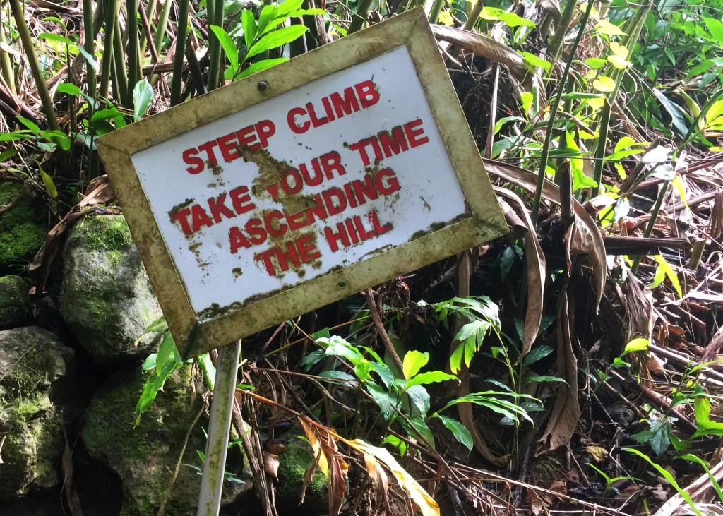 Sanaila, Lutz and Gabi take the lead knowing that I will be much slower. Dan, always the gentleman, stays behind me to make sure I am okay. Just after we cross the tiny bridge at the first waterfall the path starts going up! When I say up, I mean it goes almost straight up. There’s even a sign…”Steep climb. Take Your Time Ascending The Hill” that warns of the treacherous trail to come. This should have been my first clue that I truly should have stayed back at the first waterfall and waited on everyone else. After all, it is a magical place and I could have relaxed on the rocks and gone swimming in the beautiful water but no, Dan insists that I make this trek with him.