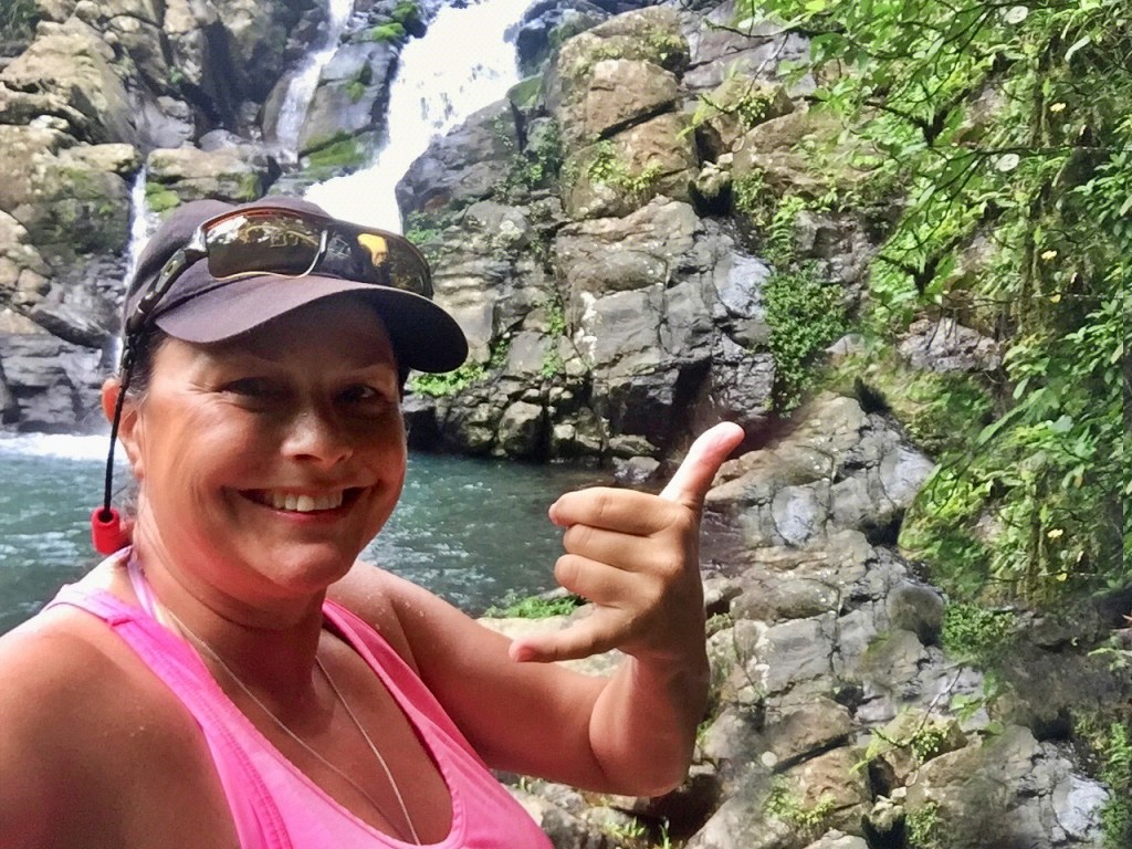 It seems like the endless hike from hell but soon we hear and then see the waterfall at the top of the mountain. We bypassed waterfall #2 to get to the top first and plan to hit the second one on the way back down. This one at the top of the mountain is stunningly spectacular and very much worth the pain to get here but there is one problem. To actually reach the base of the falls I have to trek down a steep and muddy path that has a rope on one side to keep you from falling down. The moment I see this I plant my feet firmly in the mud and say, “No more!” I have done all I am willing to do and as enticing as that cool water looks I am not, under any circumstances, traversing this steep trail only to have to try to come up it again. Nope, no way I’m doing it and I don’t care what you say!” After all, sometimes a girl has to stand her ground and this is one of those times.