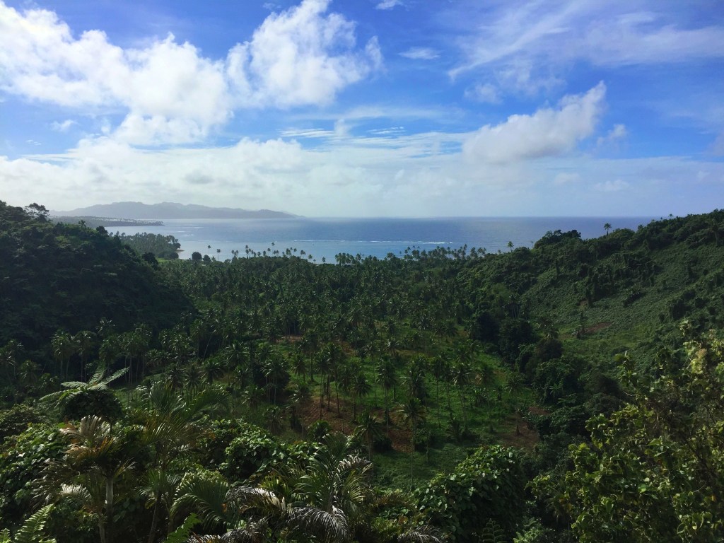 We finally round one corner and see a clearing at a shelf on the mountain. Just twenty or thirty steps away we see Sanaila, Lutz and Gabi enjoying a bit of shade under a beautiful shelter lined with wooden benches. The view from here is spectacular as we look over the lush, green jungle and out to the ice blue ocean. They have stopped to wait for us and, of course, take in the view.