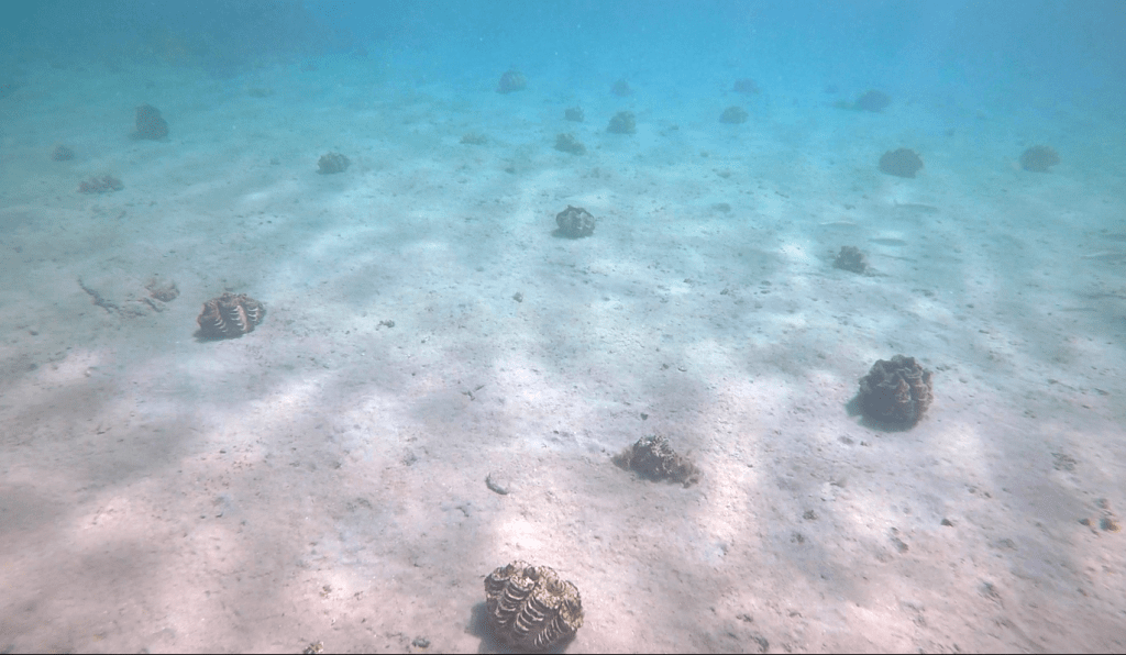 The interesting thing is that when they farm these clams on shore they take tiny ones and then set them into a wet concrete slab about a foot square. They put maybe 20-30 on the slab that has been indexed into 2-3 inch squares. Then they grow them to a suitable size to be placed in cages in the sea. They actually place the entire slab in an area where they want them to grow. Many will be eaten or won’t live but the hope is that one or two from each slab makes it to maturity. This only takes a couple of months. But, to get to the size of the ones you see in the photos here, it can take 20+ years! They can actually live to be well over 100 years old. That’s if you can keep the Chinese from poaching them. Taking giant clams or even possessing their shells is illegal here but we’ve learned that just as they do with the sea cucumbers in Tonga, the Chinese will poach these at the first opportunity. It’s very sad.