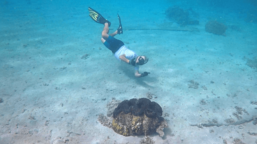 Since they grow these clams here they actually have marked buoys to show you where they are located. They really aren’t far from shore but the water is probably close to 5-6 meters deep. Fortunately the water is very clear so you can easily see them. The first one was in the deepest water and I wanted my picture taken with it. The problem is I’ve had some sinus issues the last few days and I just couldn’t free dive down that deep as the pressure in my head made it feel like my eyeballs were going to explode!