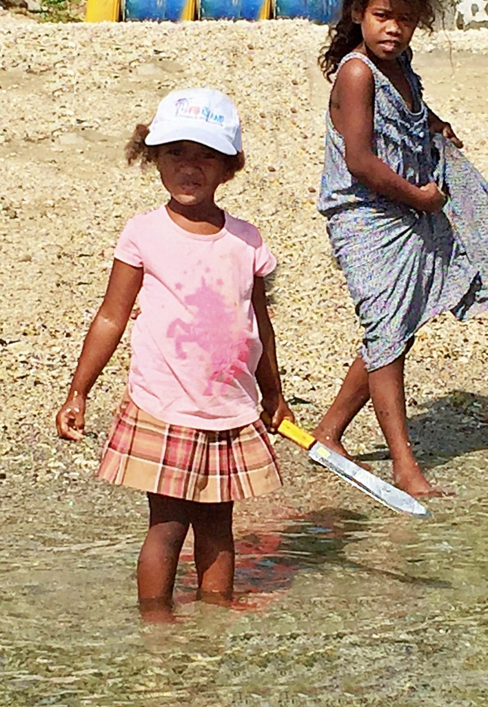 As we reached the outdoor kitchen we found Tamekai sitting on the wooden platform with Emma. Emma is the sweetest, most adorable little four year old you can imagine. She stole my heart the very first day we came ashore.