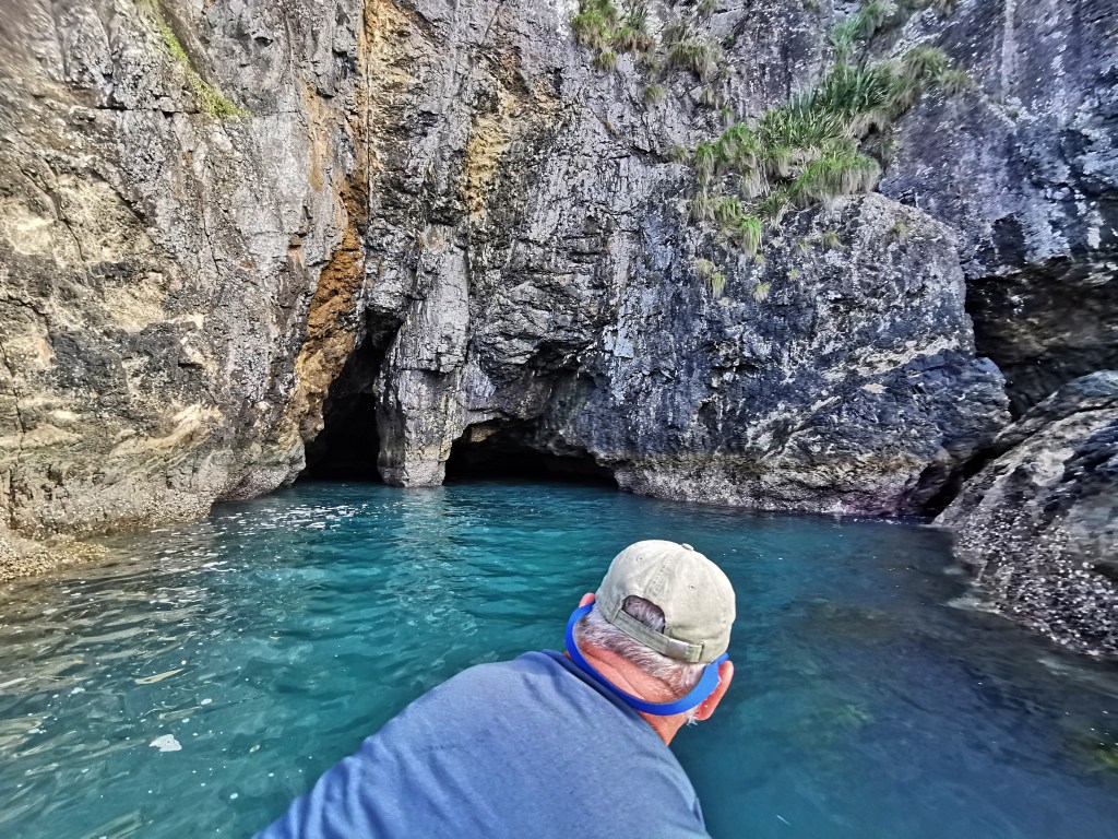 After a couple of anchor down beers and a little rest we put the motor on the dinghy and decide to take a little cruise around the bay with a fishing pole to see if we can catch anything. I’m in awe of our surroundings. The crashing surf sends white foam high into the air as it lands upon the sharp rocks lining the shoreline. Dotting the mountainous shore are caves that penetrate into the stone walls that tower above the sea.