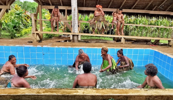 With the men’s dance complete we are taken to the pool. Yes, it’s a pool of sorts that is half filled with water. All of the women are now in the pool and Celia explains that they will play the water music. The dancing was amazing but this, this is something you really have to see to believe.