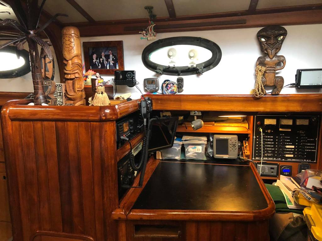 The first day I started by removing all the hardware to make varnishing a bit easier. Bells, whistles, cleats, lights, barometer gauges, wooden phallic symbols, I mean tiki statues, adorning the top of the navigation station. Once all items were removed I started sanding. We hadn’t moved up to the Air BnB yet so I made some plastic drop cloth curtains that separated the saloon from the galley area. I then started creating a white cloud of sanding dust. The vacuum was running and the orbital and dermal sanders were whirring; followed by intermittent hand sanding of all the nooks and crannies.