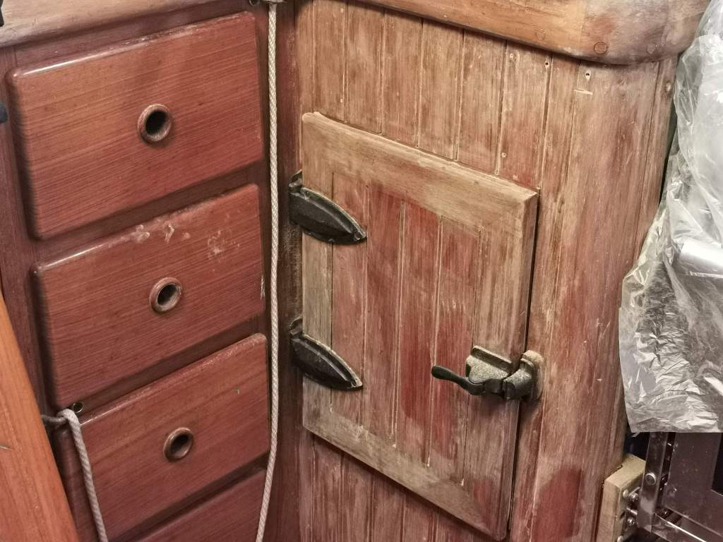Day 2, we moved daily operations up to the Air BnB so Jilly could start binge watching West Wing with the provided free Netflix and Amazon Prime video along with full internet access so she could also work on our blog. I walked down the hill and finished sanding and vacuuming and preparing surfaces for varnishing. A long day, but a lot was accomplished. Tape was put down, initial sanding done and I was ready for the first coat of varnish. During this job there were several areas that did not require being sanded down to raw wood, however, many of the fiddle block edges needed a deep sanding to remove all the old finish from years of use. Before heading back up to the flat on top of the world, I wiped the raw wood with some good quality teak oil as a wood sealer to help bring back some of the rich teak look on all of the raw wood.
