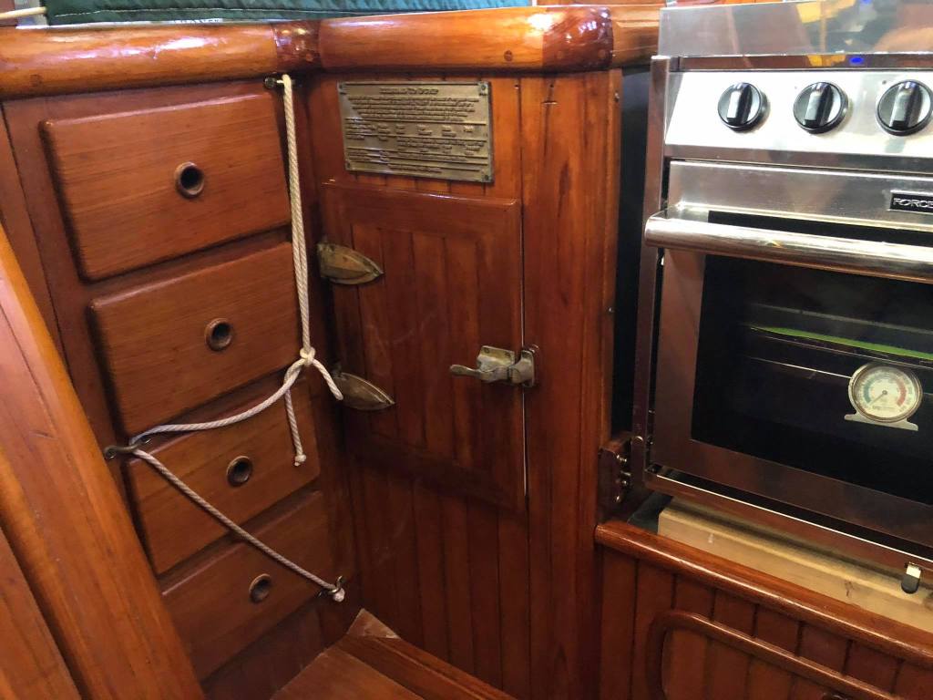 Day 5, I struggled with the decision of whether to apply a hand rubbed varnish finish or leave the gloss finish. I finally decided to pull up short and leave the gloss finish in the galley and the navigation station. Part of me wants to believe that it may be a bit more water resistant around the galley and the opened companion way. Only time will tell if I have chosen wisely. LOL