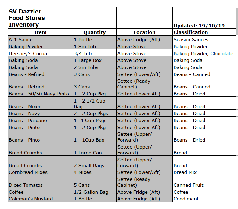 Noonsite.com is one of the best resources out there but even they can be behind the curve because things are changing so rapidly so please, just do your own due diligence. - Food & Stores Spreadsheets. We actually provide a spreadsheet of our food provisions at each check in. On that sheet we include the item, quantity, location on board and classification. We sort it by classification so that when Biosecurity is looking at it they can determine quickly what they might need to take from us. Be prepared, they will likely take something. It could be beans, popcorn, leftover meat or veggies…whatever. Our philosophy is this….We’d rather have too much food than not enough. You don’t know when a passage could take longer than planned. And, if they need to confiscate a little food because we over provisioned then we did great!!!