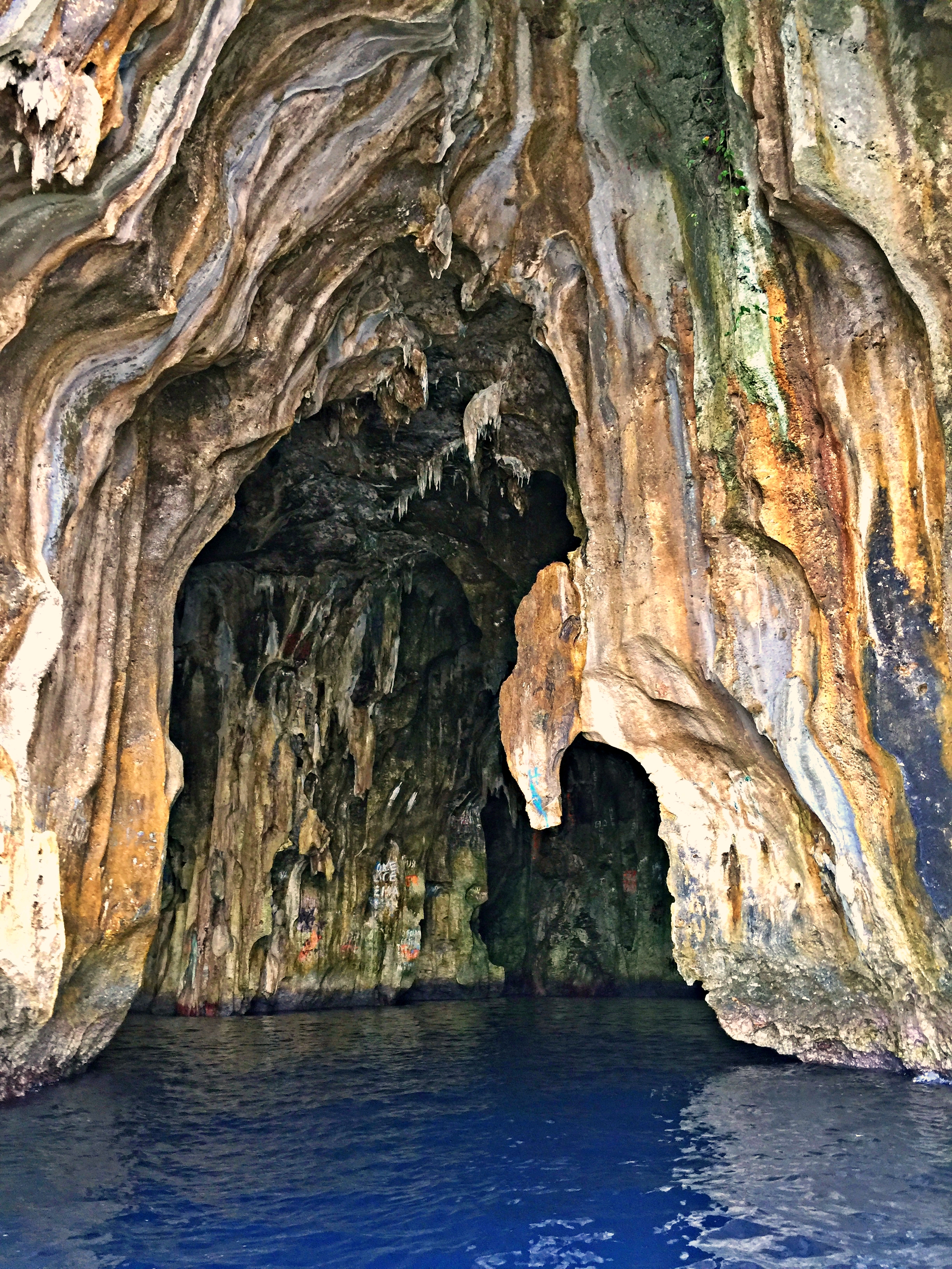 The water is very deep here and there’s no place to beach your dinghy so either you need to leave someone in the dinghy try to drift inside the cave and tie up to one of the outcroppings. Inside the cave it’s about sixty feet deep. We did not snorkel the cave since there were only two of us and too many people around to tie the dinghy up inside. It’s a pretty beautiful place though and we’re certain if you love caves you’re going to really love this one.