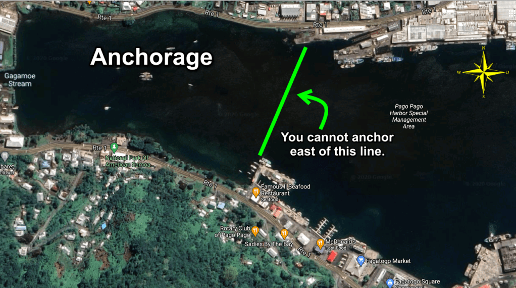 The check in process is pretty straightforward but not exceedingly quick. Notify the harbor master on VHF 16 prior to your arrival. We tried this before entering the harbor however their antenna isn’t the greatest so we couldn’t hear them. Not seeing any large ships moving about we entered the harbor and were finally able to reach them after rounding the corner. They will give you instructions as to where you can and cannot anchor in the bay. (See map below for anchorage restrictions).