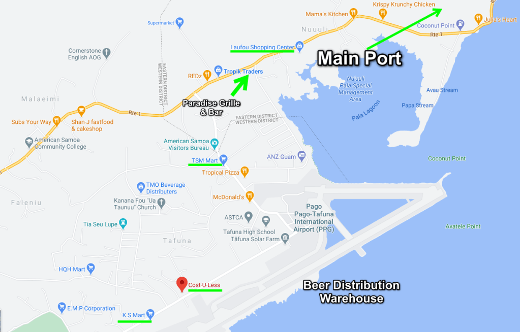 We found a beer distribution warehouse on the main road in Tafuna between the airport and the Cost U Less and they actually sold cases of beer to us directly. (See map above) We got an amazing deal! Don’t remember the name and can’t seem to find it on the net but it’s not hard to find. It will be on the south side of the main road about a half a mile east of the Cost U Less. The building is a large metal warehouse looking structure. If you have a car or taxi and they are open we highly recommend getting your beer here. It was the best deal in town.