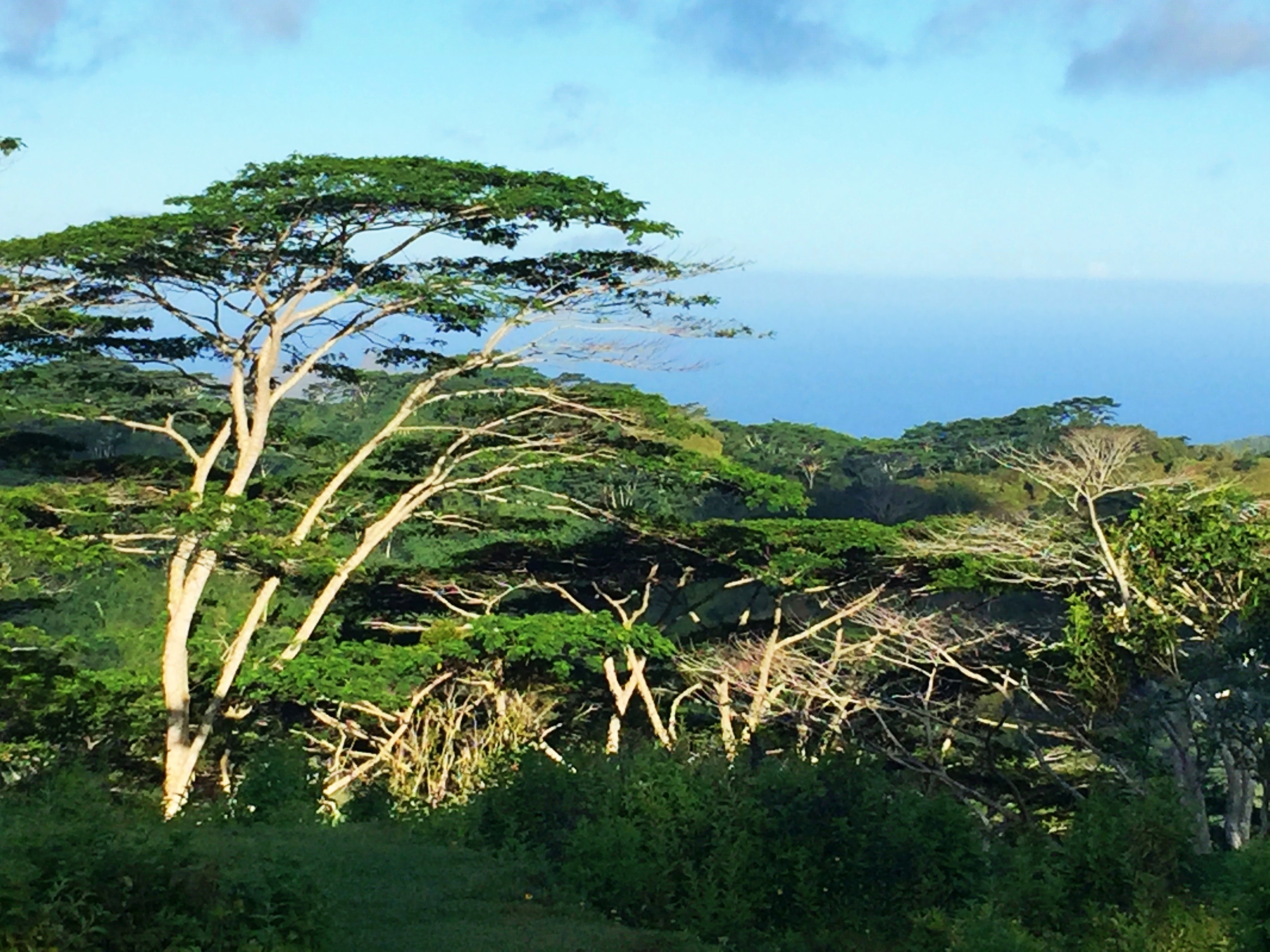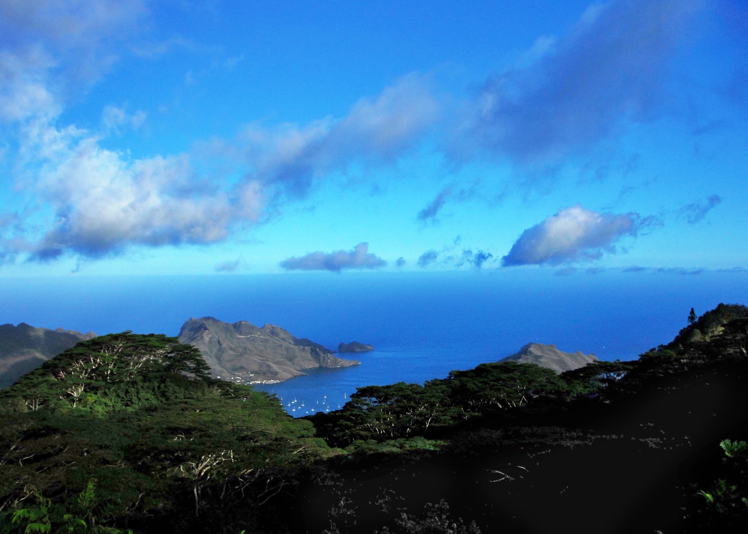 On the way back we took a little detour based on Kevin’s suggestion and stopped at an overlook at the Too’vi’i Plateau and Grand Canyon. You see, Nuku Hiva is divided into two sides, the western side where all the people live surrounding the bays and the eastern side where the airport is located. In between, lies the Too’vi’i plateau which lies 3000 feet above the ocean. On top of the plateau it feels less like a tropical island and more like the an evergreen forest with huge pines and other deciduous fauna. Interestingly enough the pines are often referred to as “Cook Pines” because it is said that Captain Cook planted them in the islands all over the South Pacific so that he would alway have straight and sturdy wood to fix masts and booms on his ships.