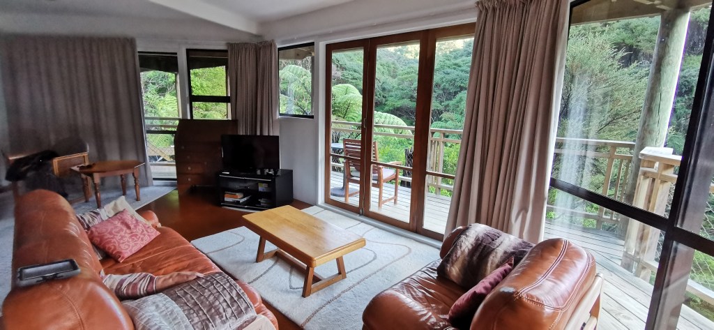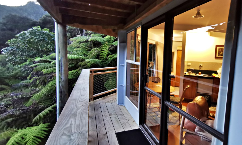 The unit itself has 180° of windows looking over the lush green forest with doors that open onto the beautiful wooden deck. From the deck you can see the the tops of the fern like Ponga trees which are some of my favorite trees in all of New Zealand. Below the deck you can hear the gurgling of the stream and at night you can even hear the screeching of the ever elusive Kiwi birds as they scurry about the forest floor. (Click to hear what they sound like.)