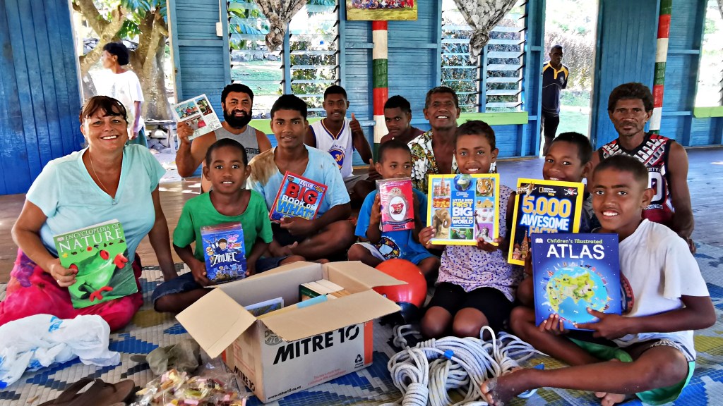 After a few anchor down beers we were off to do sevusevu and what a treat it was for us. Our first contact on the island was with Enoki. He’s an elder on the island and was so sweet to us. He asked us to sit on the grass and chat after we presented our sevusevu to him. When we showed him the Faces of Fiji book his smile widened and he reached to touch my hand. It was obvious how special he thought it was that we’d taken the time to create something like this for them.