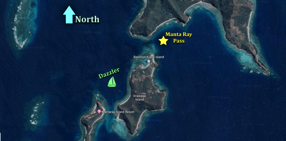 In the Yasawa Islands there is a place called Manta Ray Bay. It’s considered “THE” place to go in Fiji if you want to swim with the Manta rays. The bay is bordered on the north by Naviti Island and on the south by Nanuya Balavu Island. In the middle is a small island called Drawaqu. We anchored just to the west of Drawaqu in about 50 feet of crystal clear water. It’s a beautiful spot that enjoys a really nice tropical breeze. That said, it is also a place where you need to make absolutely certain you have a solid hold on your anchor. When the tide comes in or goes out there is a pretty good current that flows between Drawaqu & Nanuya Balavu islands. It’s pretty cool to watch as there will be some whirlpools caused by the upwellings and the anchored boats swing in various directions. There’s also some wrap around current that comes through Manta Ray Pass that adds to the confused sea here but we didn’t find it to be anything to really worry about. We just kept a good eye on our position and made sure our anchor alarm was set.