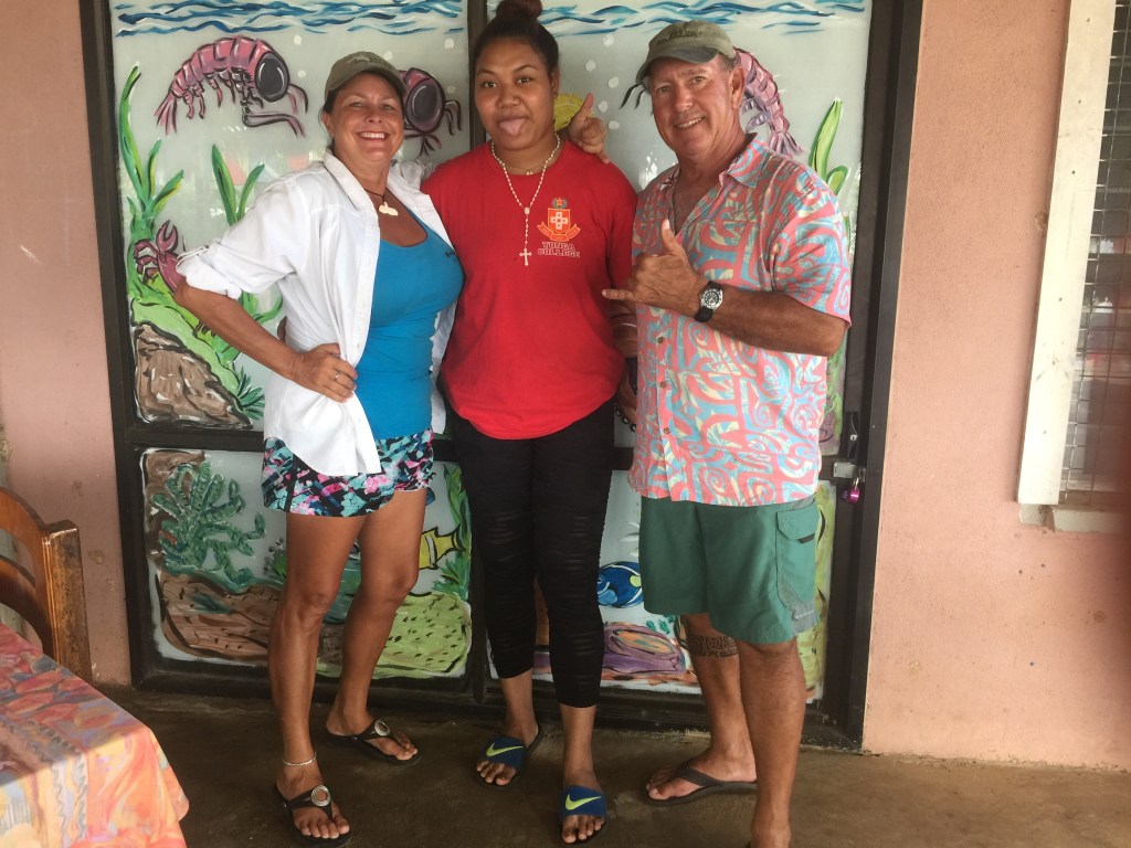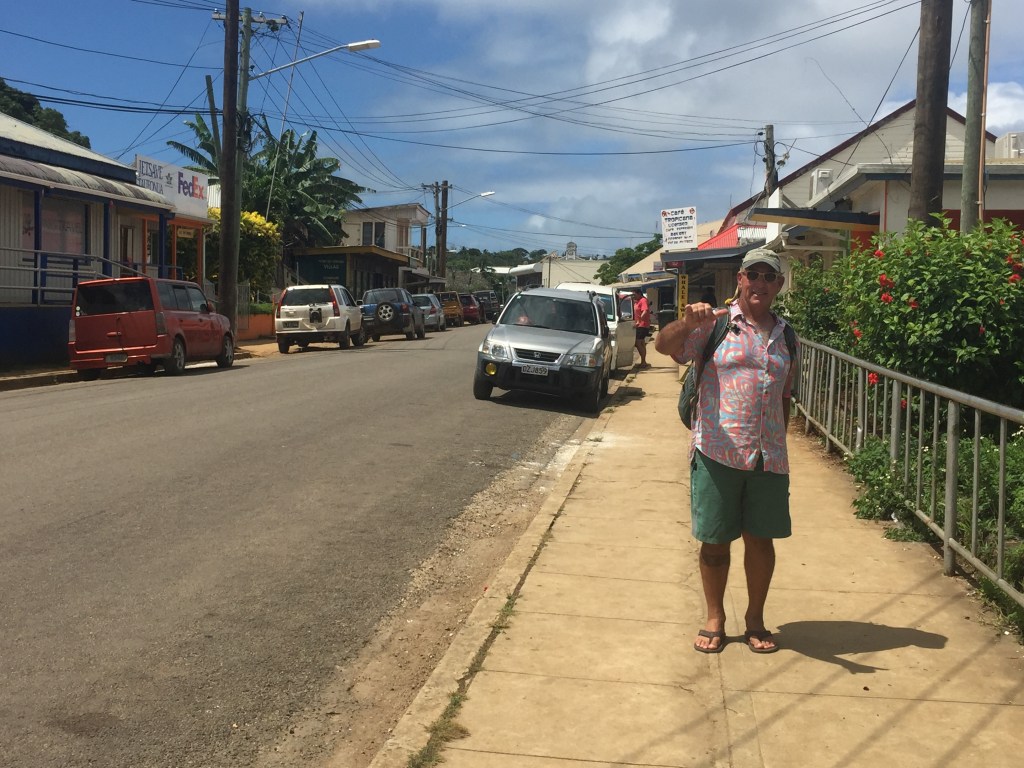 It’s just short walk to town from the Customs and market area. We are looking for our friend, Bear. He owns the Falaleu Deli as well as the Hideaway. I need to know what is going on with the barge and when exactly I am going to get some of that delightful fish and chips. We heard on the radio that he moved his deli into town so we seek him out. We find him under the big mango tree in a very small white building. After hellos and hugs we chat a bit. He updates us on all the happenings since we left last October. He tells us that the Hideaway has moved down closer to the wharf and is not open now but should be within a few days as they were dealing with some issues from the licensing board. Dang! Guess I have to wait a few days but at least I know it’s going to be soon. Anyway, we bought some of his amazing and spicy Italian sausage and then moved on to our next stop.