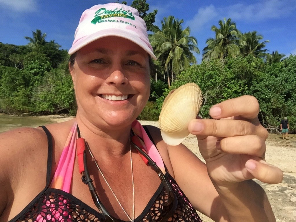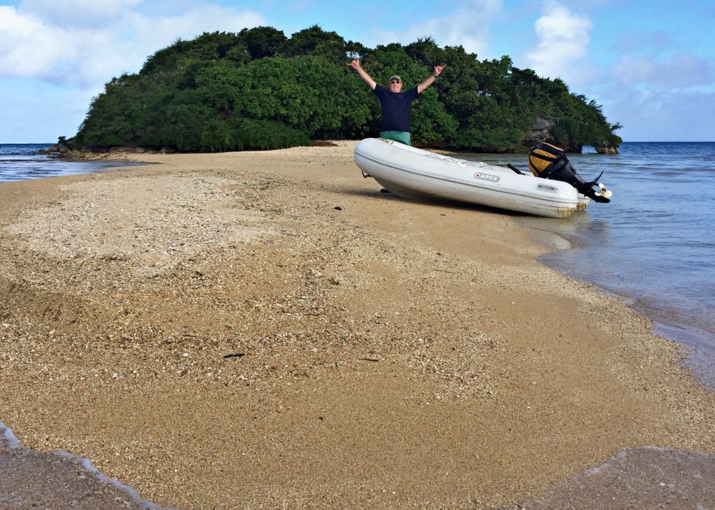 The surf on the north side of the island was choppy and gave us a bit of a wet ride as we cruised along checking out the place. On the east side of the island is a smaller, unnamed island that had a bit of beach so we decided to check it out. I’m always looking for cool shells. This island was surrounded by it’s own little reef so it got shallow pretty quick. I didn’t have my good beach shoes with me so Dan got out and towed the dink through the shallow waters. He didn’t want me out there for fear I’d step on a Stonefish. That’s my guy, always looking out for me.