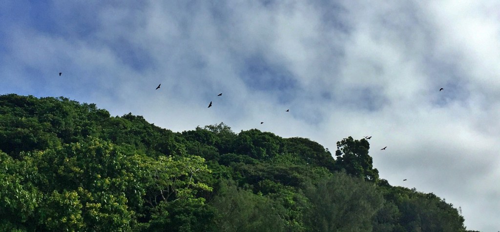 We took the dink all around Mafana Island. It’s a pretty little place with a few homes but there are only a couple of places to land. On the north side are some really pretty areas of volcanic rock. There’s even a small cave. As we tooled by we apparently disturbed some of the local wildlife. Suddenly a host of birds burst out from the trees and came flying overhead. Seconds later we saw about fifteen or twenty flying foxes come swarming out from the treetops. I just love watching the flying foxes. They are really amazing and pretty big too.