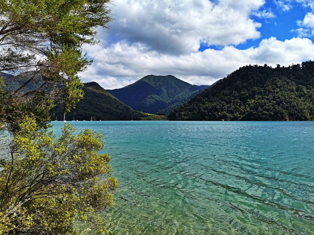 Our next interesting moment came when we rounded Harding Point headed into the Te Kakaho Channel. From my place on the bow it looked as if there was a coral reef ahead. There wasn’t one. It was one of those areas here in the sounds where the currents meet and there are lots of upwellings and swift tidal currents. We’re quickly learning that sailing in the sounds (or motoring) is not for the faint at heart. You have to know how to handle some pretty interesting and challenging seas and currents….even more so than we’ve ever dealt with in the past.