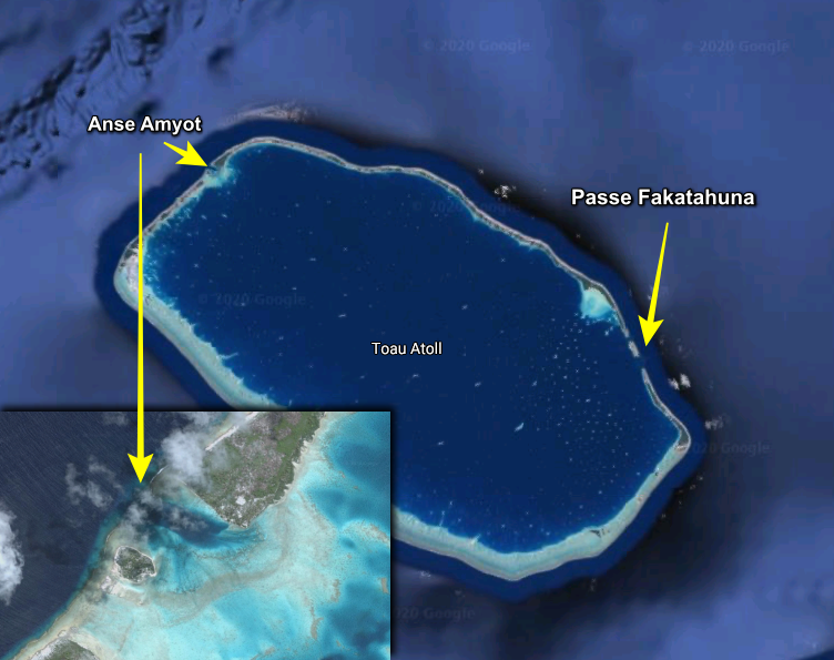 Anse Amyot at Toau is a preferred stop for cruisers coming to Toau. There is an actual pass into the atoll called Passe Fakatahuna on the southeastern side. We chose, however, to stop Anse Amyot which is a false pass. It is actually a cove in the atoll is about 150 meters across. The southern end of this cove is blocked by a large coral reef and shallow waters so there is not actual access to the lagoon. Some will tell you this creates a great “all weather” anchorage but we can tell you from experience that is NOT the case. You can learn more about our experience reading the article below.